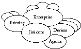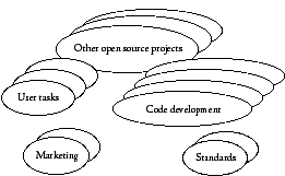 FIGURE 3.3. Communities built around common interests.Each of these communities has its own special interests; for example, some communities connected to Linux might include system administrators concerned with installing and configuring the Linux operating system on various types of computers. Another group of people might be concerned with business productivity tools (such as word processors, spreadsheets, and presentation tools) that are available for Linux--their focus is on what tools exist and how to use them. A third community might form around computer games available for Linux, with a subcommunity around a specific game such as Quake--this group would focus on exchanging tips, rumors of new games, and finding opponents to play with. Each community will flourish or wither depending on how well its interests are met by the community resources. For example a community of newbies asking basic questions about how to use a piece of software will succeed only if more experienced users who can answer those questions are also part of the community. In the course of a successful open-source project, different communities will come and go. New ones will spring up, grow, and possibly become dormant or die. As long as there are always some thriving communities, the larger open-source project can be considered alive and well. Note that death of a community does not equal failure. Consider a community that arises to develop a new standard. After the standard it developed has been accepted by the larger Internet community, the community has achieved its purpose and is no longer necessary. If future revisions to the standard are called for, the community might be resurrected. Examples of Multiple CommunitiesTo make this more concrete, let's look in depth at some of the different communities within two Sun-sponsored projects, Jini and NetBeans. JiniJini technology is a simple distributed computing model based on the Java programming language developed by Sun. Among other things, it was intended as a model for services--small bits of functionality--to discover each other dynamically and create a network of interoperating program parts. These services could be housed within devices--physically separate computing platforms as far as Jini is concerned. For Jini to succeed, it was clear that the underlying Jini protocols and infrastructure would need to become pervasive, and to accomplish that would require a strong community of participants and partners. Moreover, Sun did not have the expertise to define Jini services in areas such as printing, digital photography, storage, white goods, and the many other potential markets for products that would benefit from being network enabled. Within the Jini Community that has developed since the core code was released, there are many separate communities focused on creating Jini services in different application areas, as shown in Figure 3.4. A small number of developers care about further developing the core Jini code. Others care only about areas such as printing or enterprise applications or building networked appliances that use Jini to connect to services. People working in one application area often have little in common with those working in another area. For example, those people working on creating services for appliances in the home have a very different set of concerns from those using Jini to connect legacy enterprise applications.