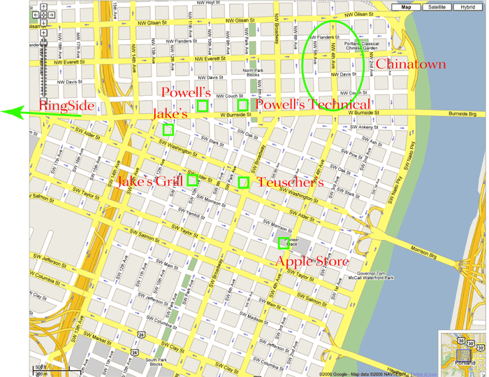 This is my favorite steakhouse in Portland. There are several others, like Ruth's Chris (which is easier to get to), but RingSide is an old-fashioned steakhouse with a dark atmosphere. It's just off the map to the left at basically Burnside and 22nd Street.
